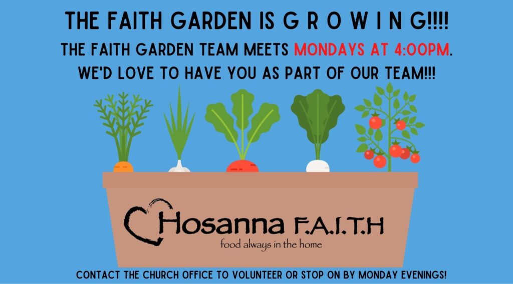 People that may be interested in helping out, we are always looking for assistance with watering. Also, we meet on Monday nights at 4:00 pm at the old Hosanna parking lot (now the Fields Church).
